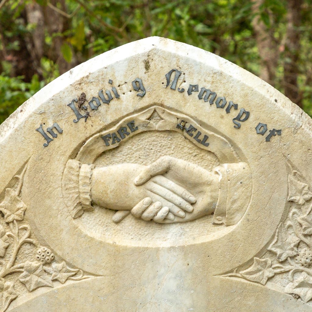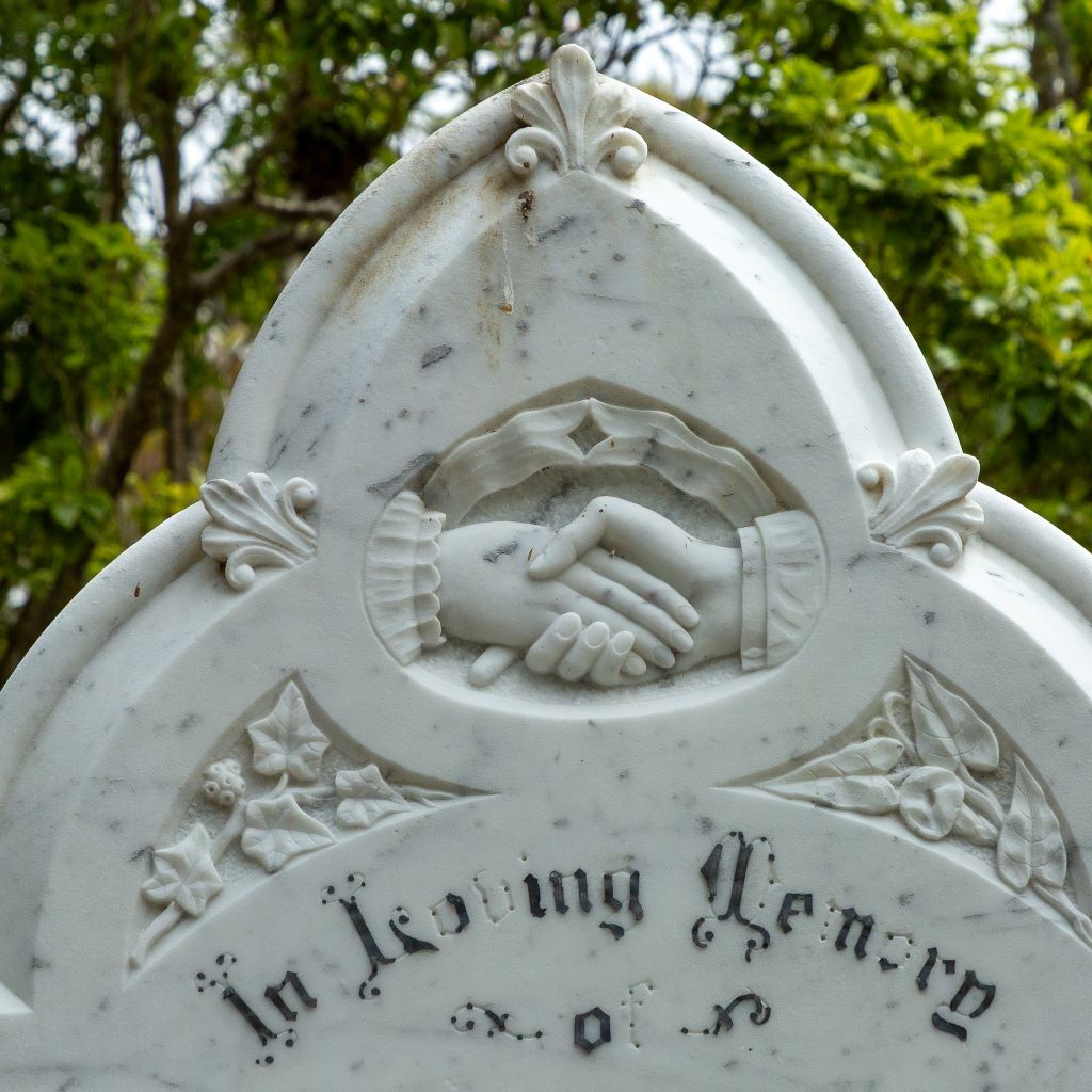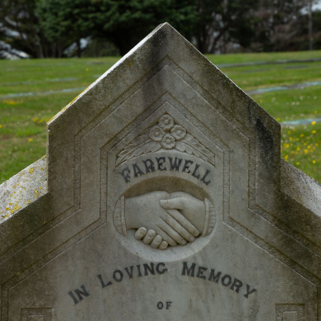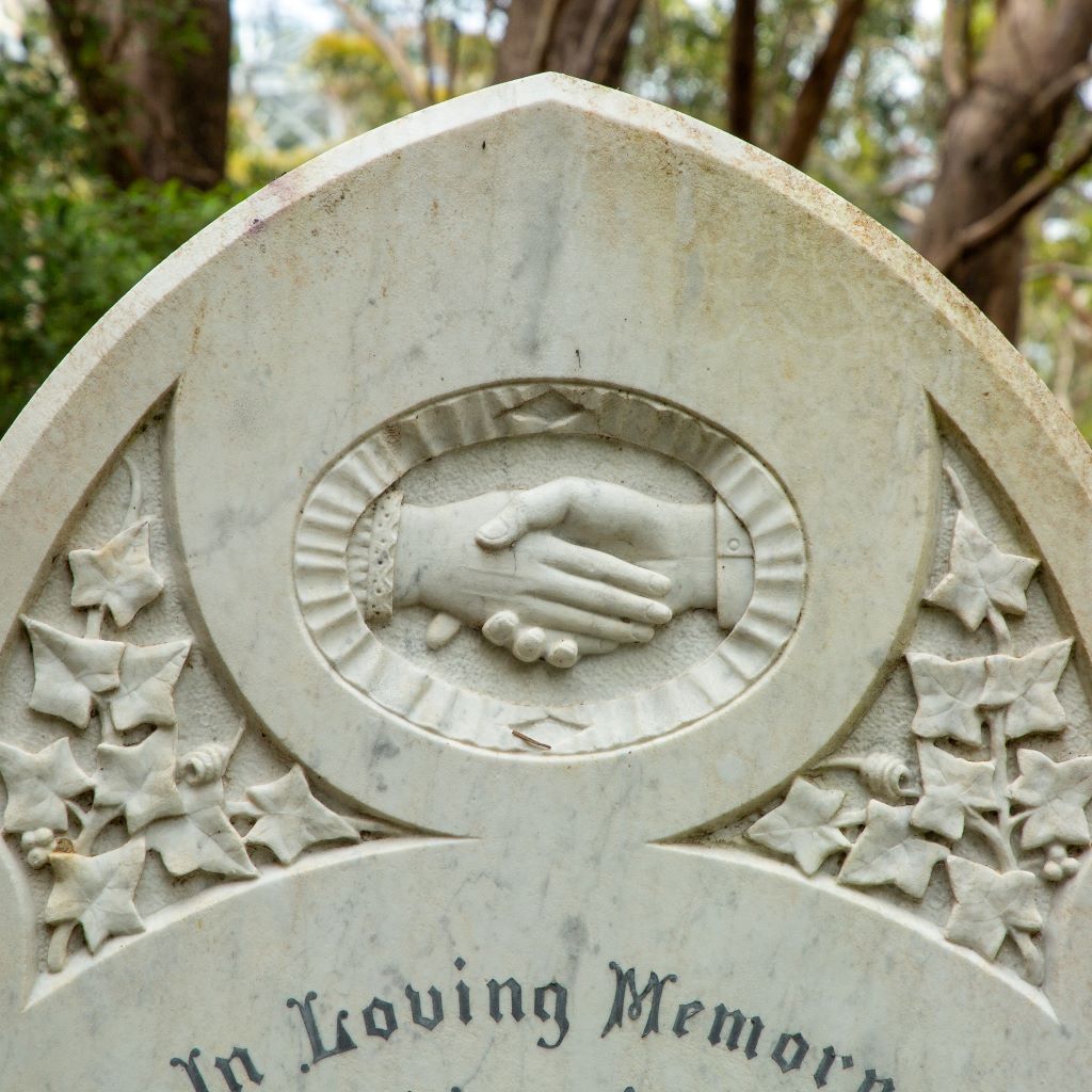 A common symbol on headstones in Karori cemetery is that of clasped hands. These represent the hands of the living and the deceased clasped in farewell. In Karori they often appear on headstones for married couples.
