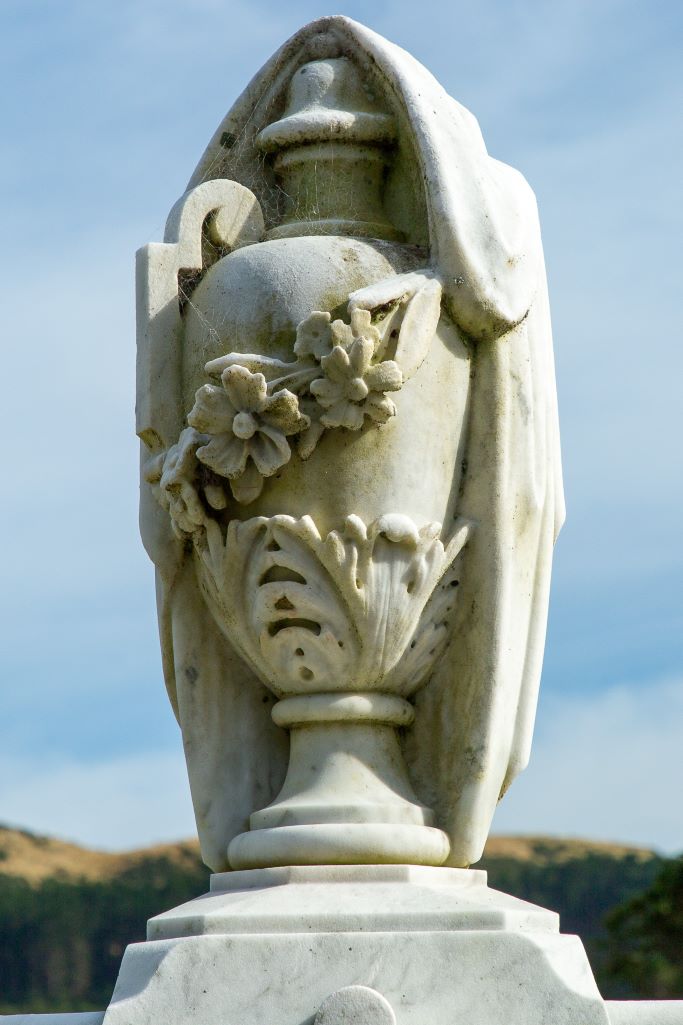Draped Urns are quite a visible symbol in Karori Cemetery. The urn is taken from the classical Greek imaginary. They are a symbol of fate or the lottery of life.