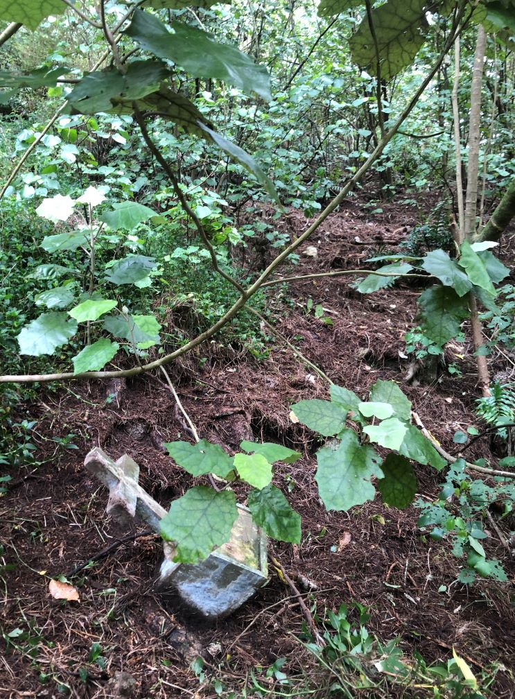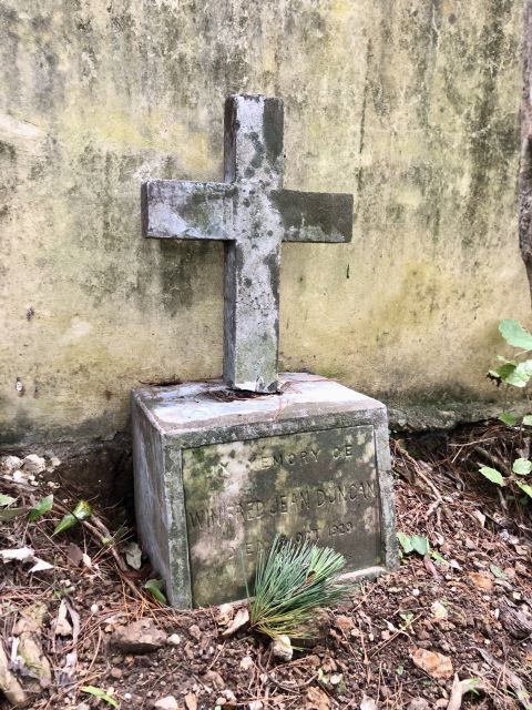 While our Gum Gully volunteers were weeding the cemetery next to Ian Galloway Park, Russell made a remarkable discovery among the tradescantia: the headstone of Winifred Duncan. The headstone appears to have rolled down the hill at some point. We let the cemetery team know, and Maarten and a colleague carefully returned the headstone to her burial location.