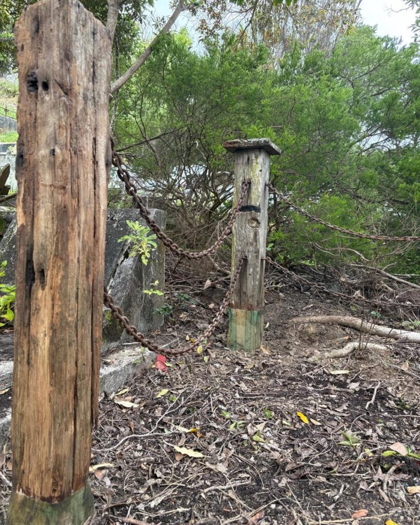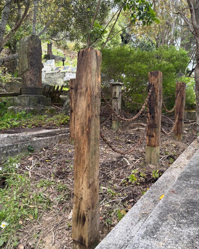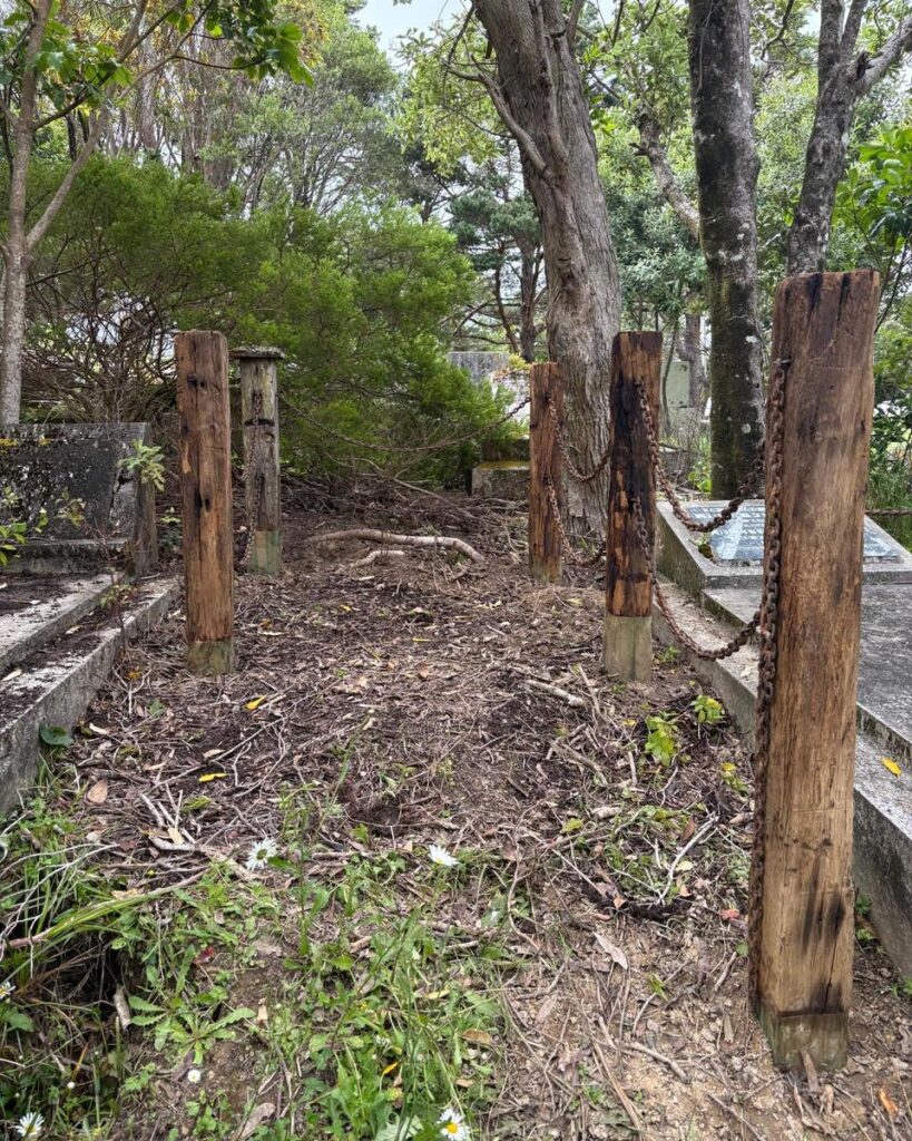 The majority of the totara posts and the connecting chain had at some stage been placed at the head of the grave, as they appear to have deteriorated at their bases. They were in pretty poor condition, however one post was still standing in its original location.